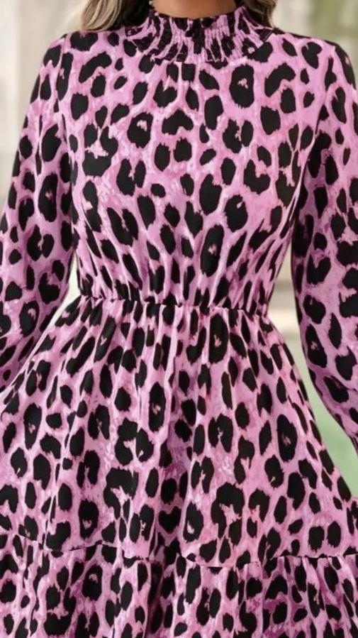 Uzun Kollu Yarı Balıkçı Yaka Leopar Desenli Modal Mini Elbise
