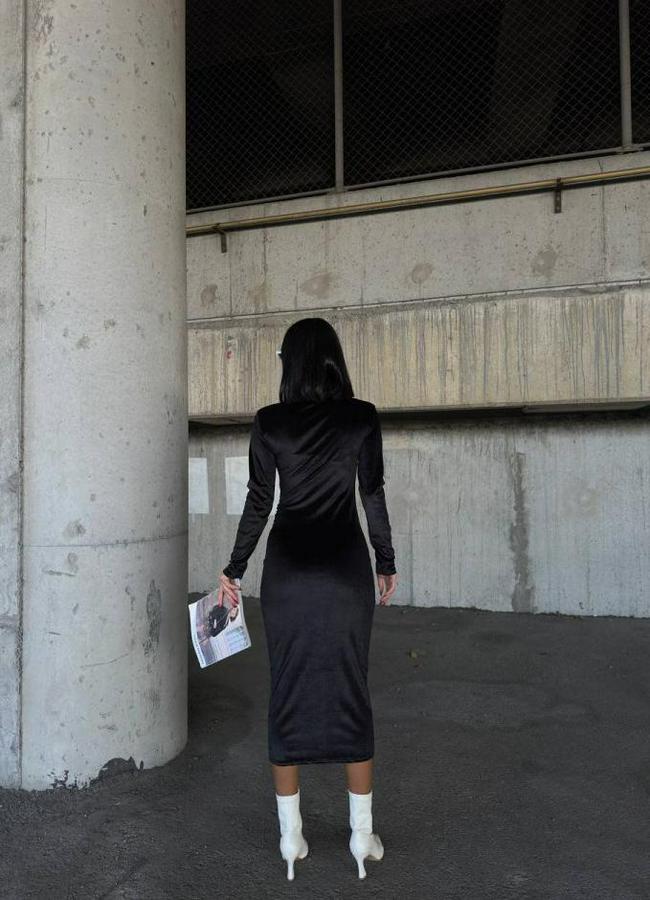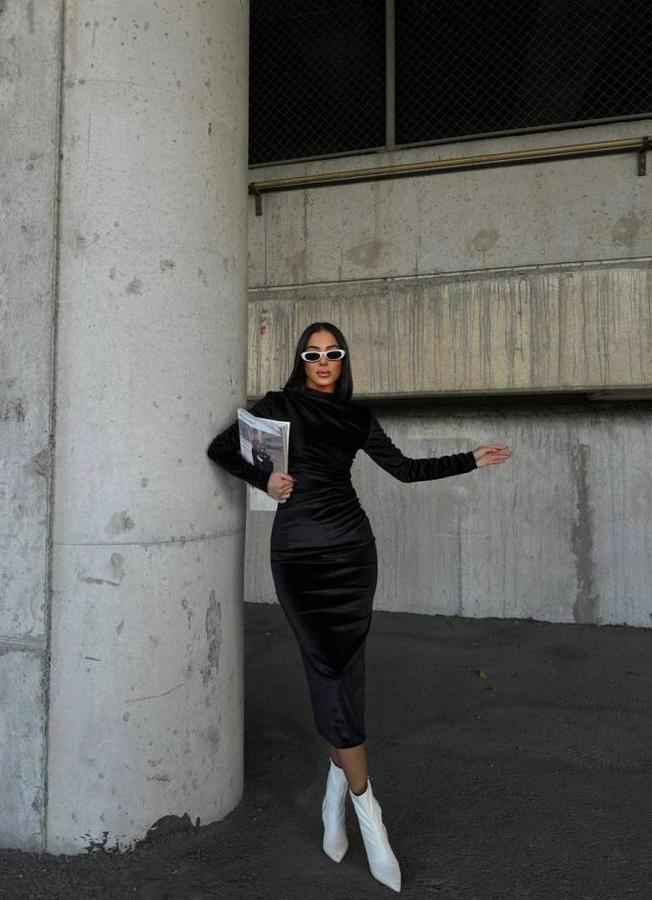 Uzun Kollu Yarım Balıkçı Yaka Büzgü Detay Kadife Kumaş Elbise