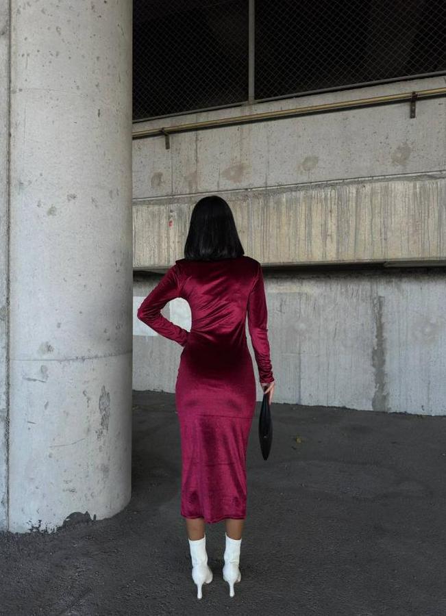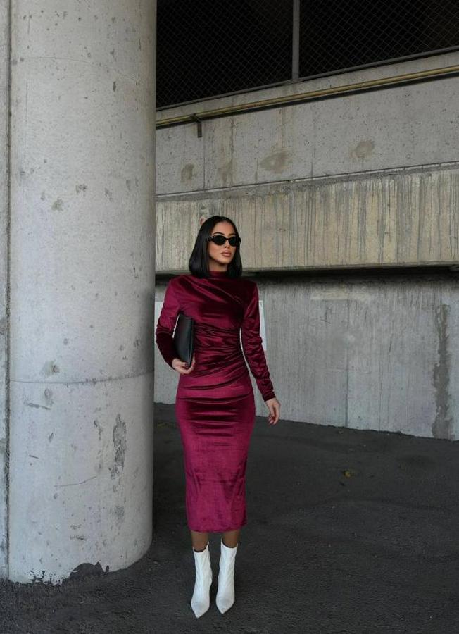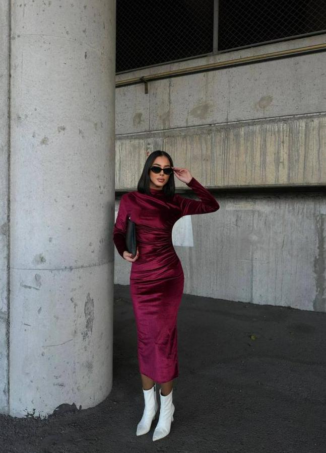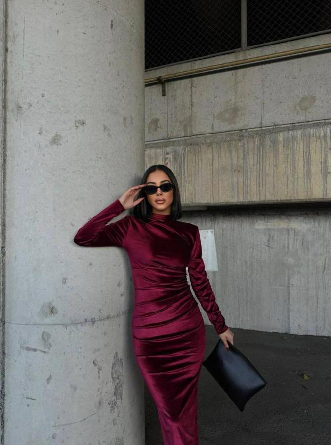Uzun Kollu Yarım Balıkçı Yaka Büzgü Detay Kadife Kumaş Elbise