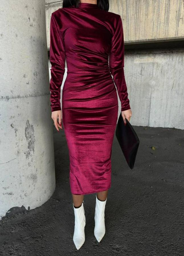 Kadın Uzun Kollu Yarım Balıkçı Yaka Büzgü Detay Kadife Kumaş Elbise