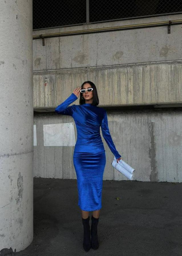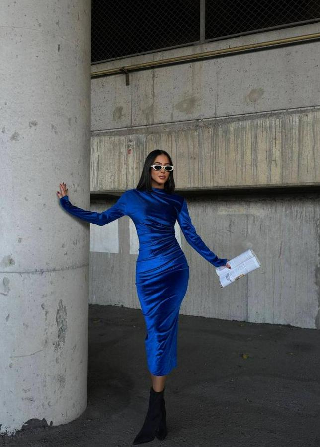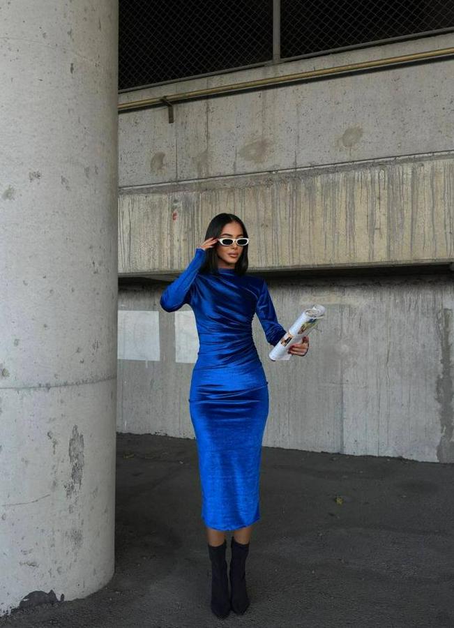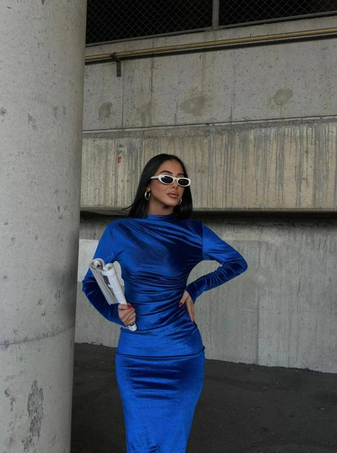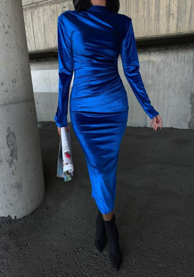 Uzun Kollu Yarım Balıkçı Yaka Büzgü Detay Kadife Kumaş Elbise