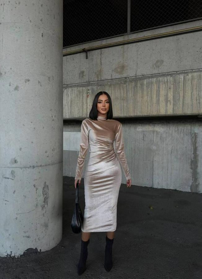 Kadın Uzun Kollu Yarım Balıkçı Yaka Büzgü Detay Kadife Kumaş Elbise