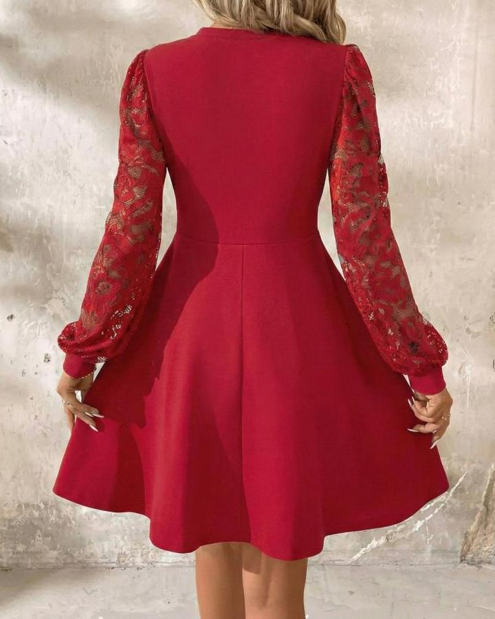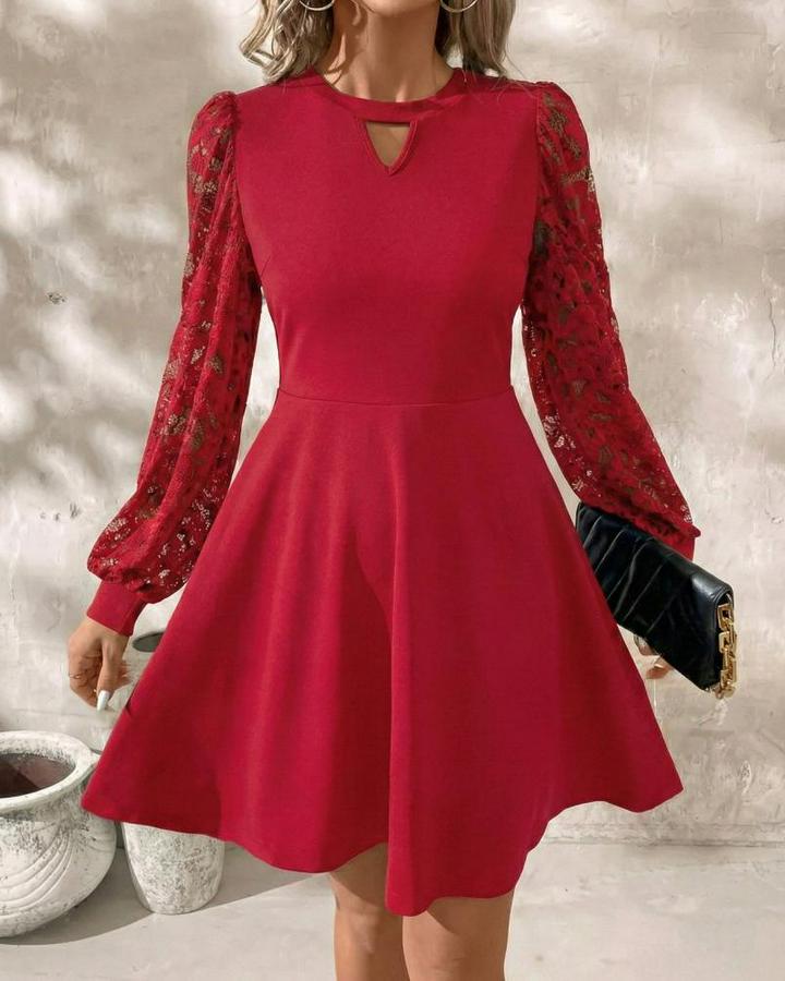Kadın Uzun Kollu Yuvarlak Damla Detaylı Kolları Tül Detaylı Kısa Ithal Krep Elbise