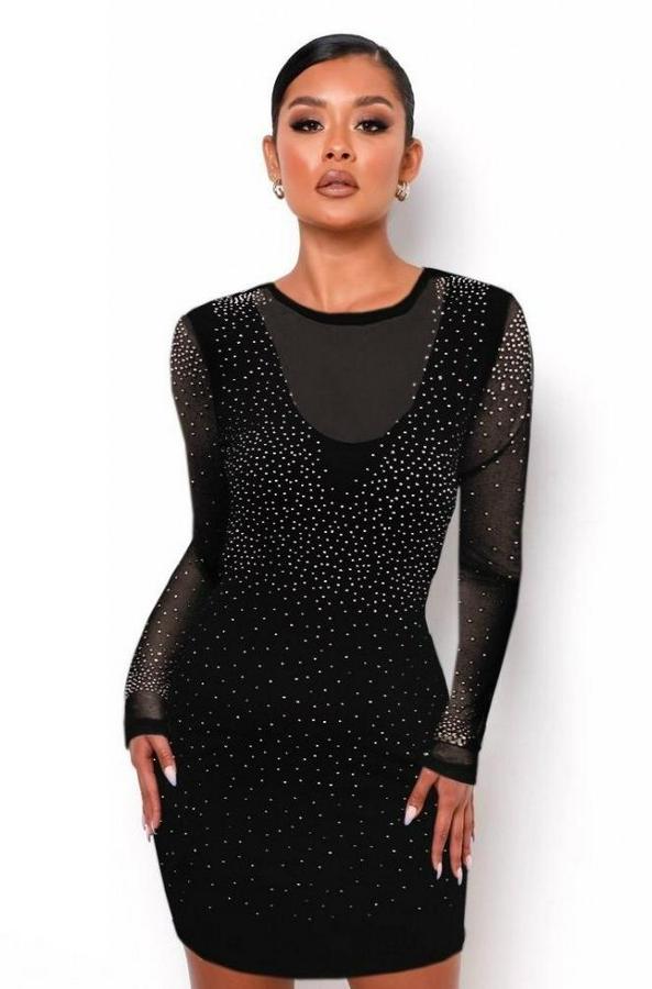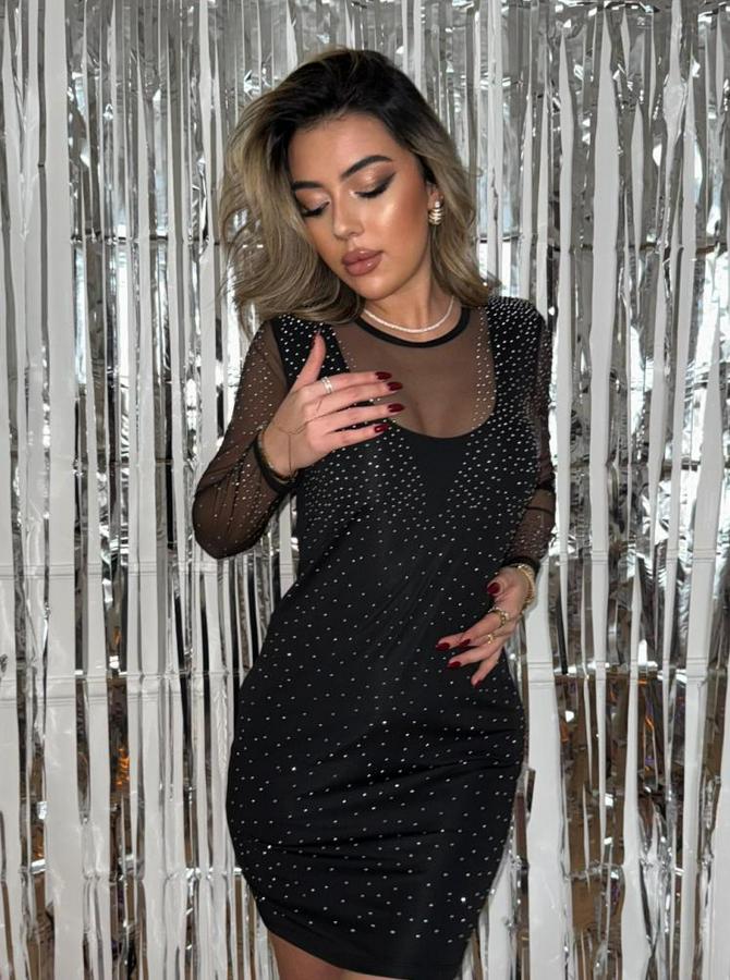 AnasayfaTüm ÜrünlerElbiseUzun Kollu Yuvarlak Yaka Dekolteli Taşlı Dalgıç Elbise