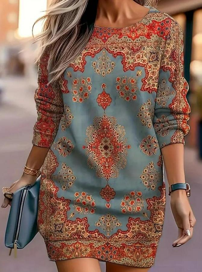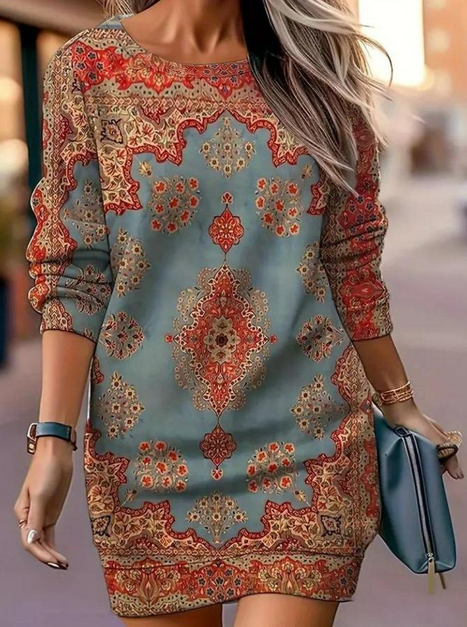 AnasayfaTüm ÜrünlerElbiseUzun Kollu Yuvarlak Yaka Desenli Mini Modal Elbise