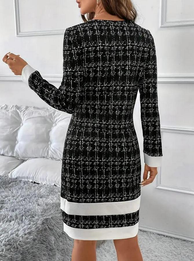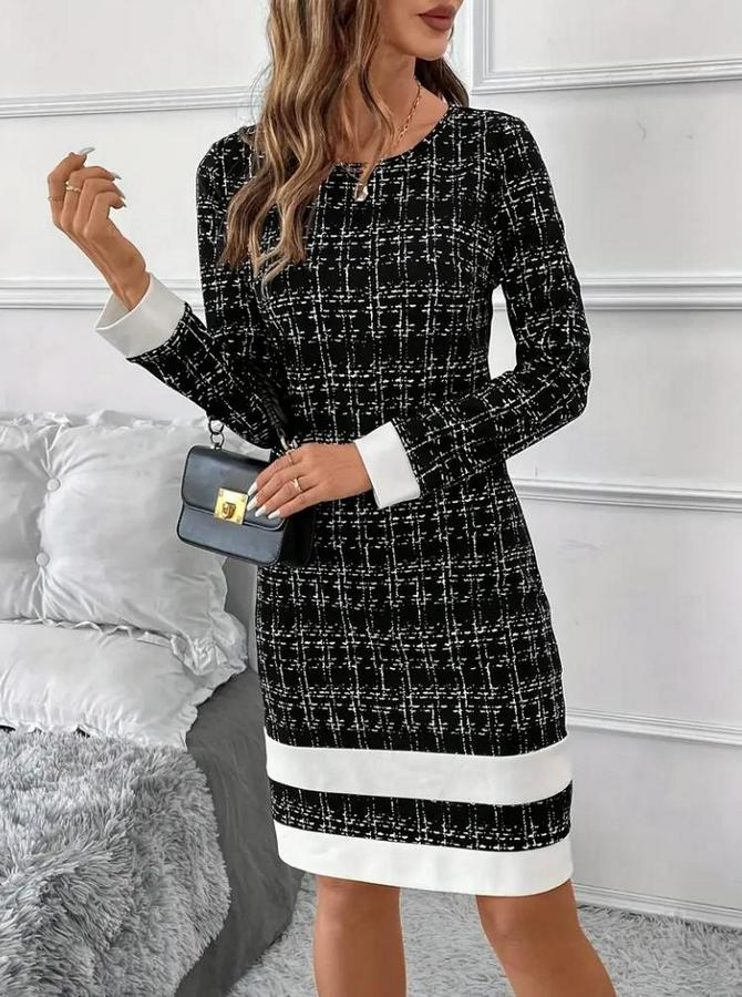 Kadın Uzun Kollu Yuvarlak Yaka Etek Ucu şerit Detaylı Kısa Dokuma Elbise