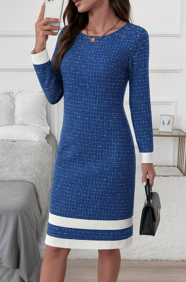 Uzun Kollu Yuvarlak Yaka Etek Ucu Şerit Detaylı Mini Dokuma Elbise