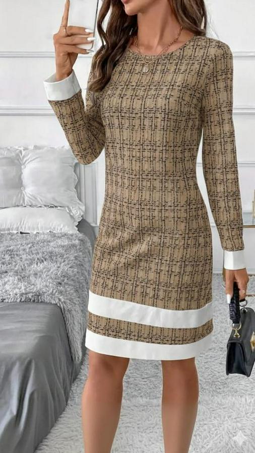 Uzun Kollu Yuvarlak Yaka Etek Ucu Şerit Detaylı Mini Dokuma Elbise