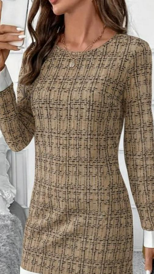 Kadın Uzun Kollu Yuvarlak Yaka Etek Ucu şerit Detaylı Mini Dokuma Elbise