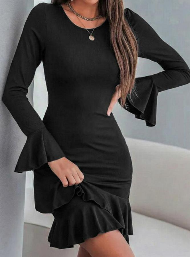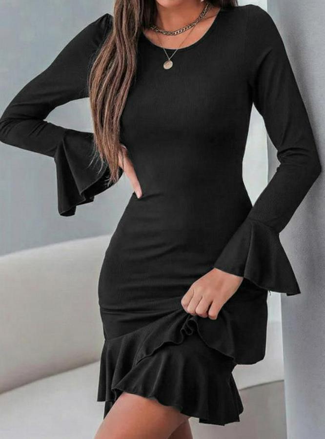 Kadın Uzun Kollu Yuvarlak Yaka Fırfırlı Kol Ucu Volanlı Janjan Krep Mini Elbise