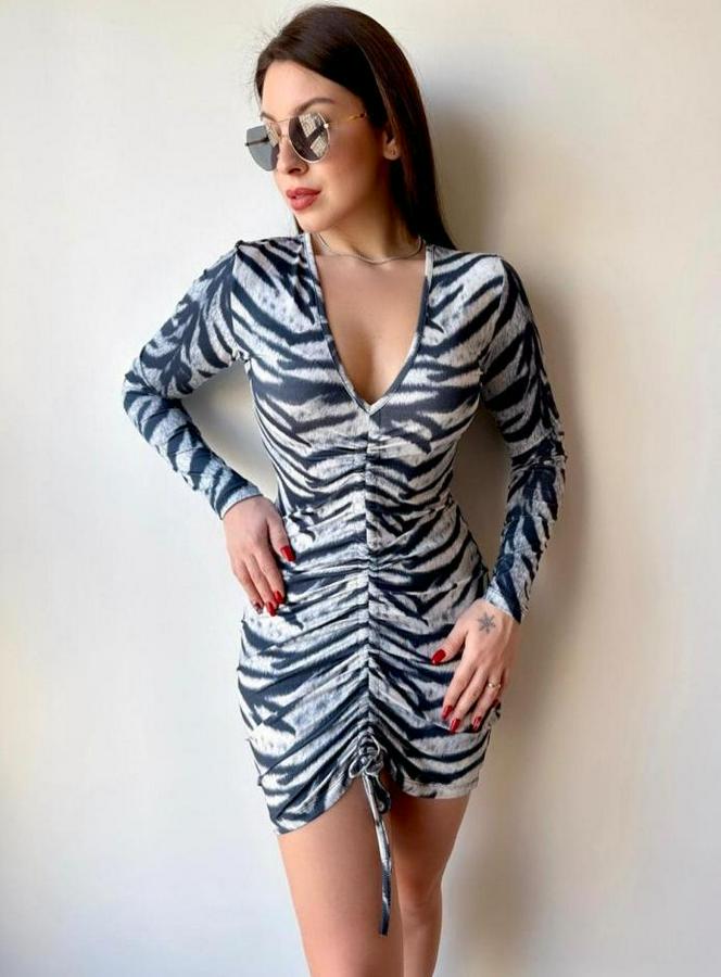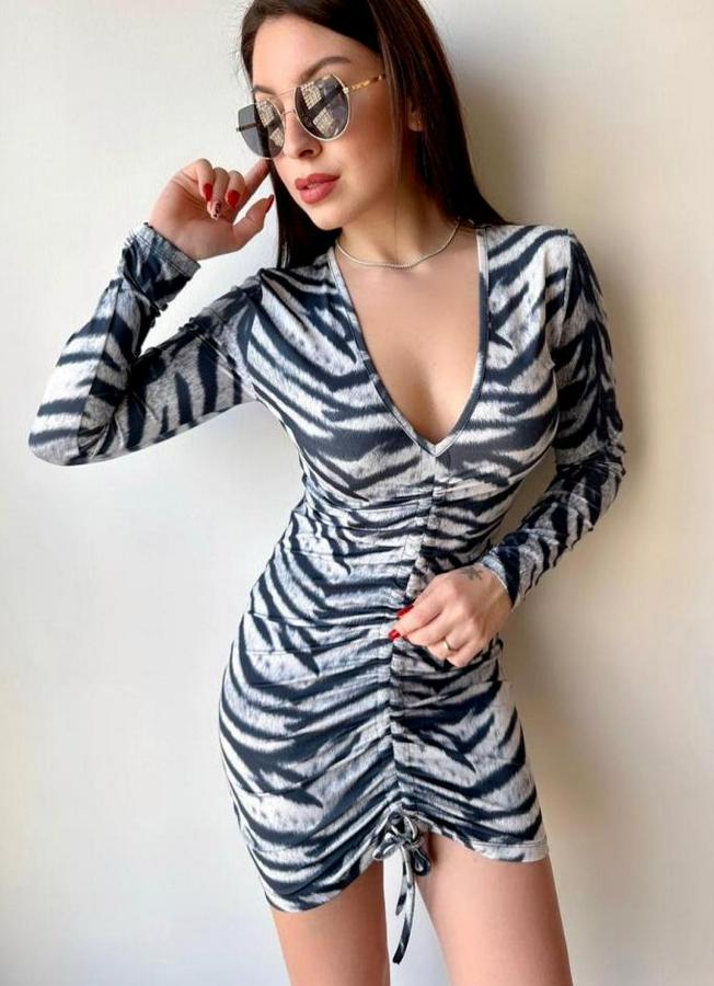 Kadın V Yaka önü Asansör Büzgü Detay Fırsat ürün Zebra Mini Elbise