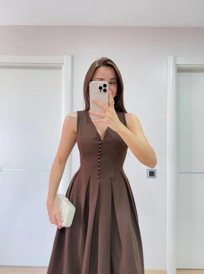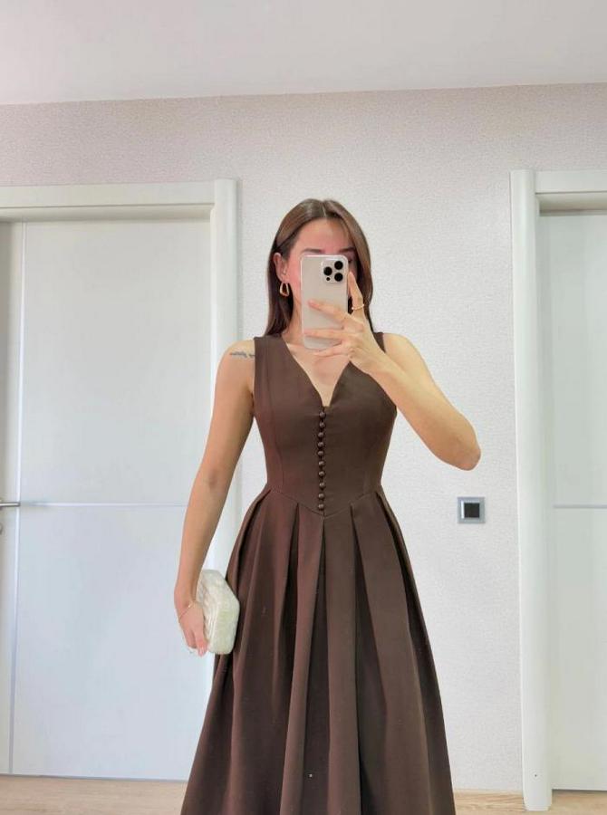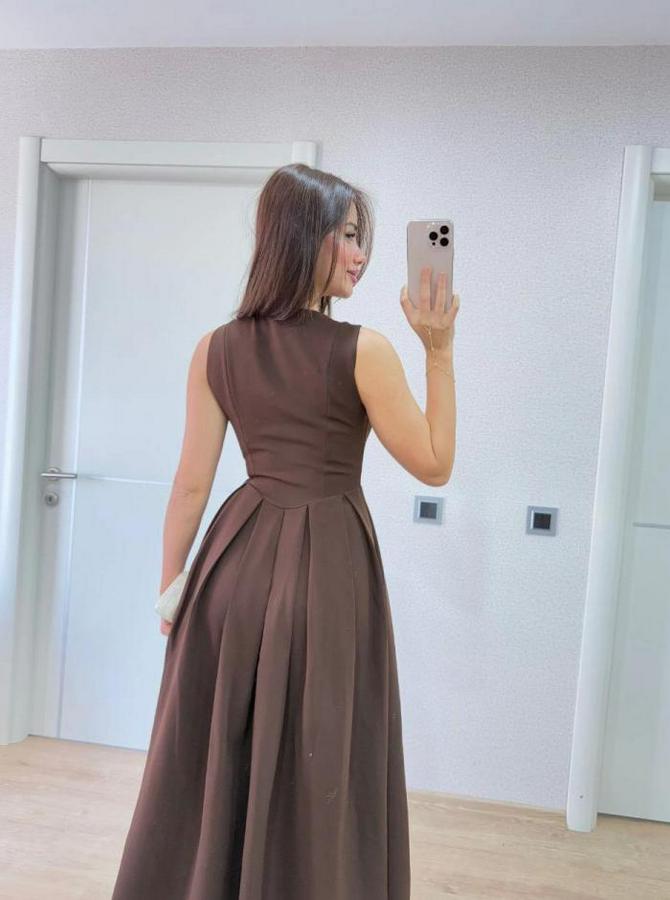 AnasayfaTüm ÜrünlerElbiseV Yaka Uzun Kolsuz Elbise- Kahverengi
