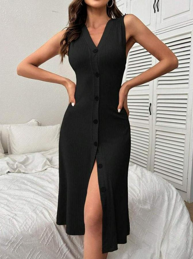 V Yakalı Önden Düğmeli Kaşkorse Elbise