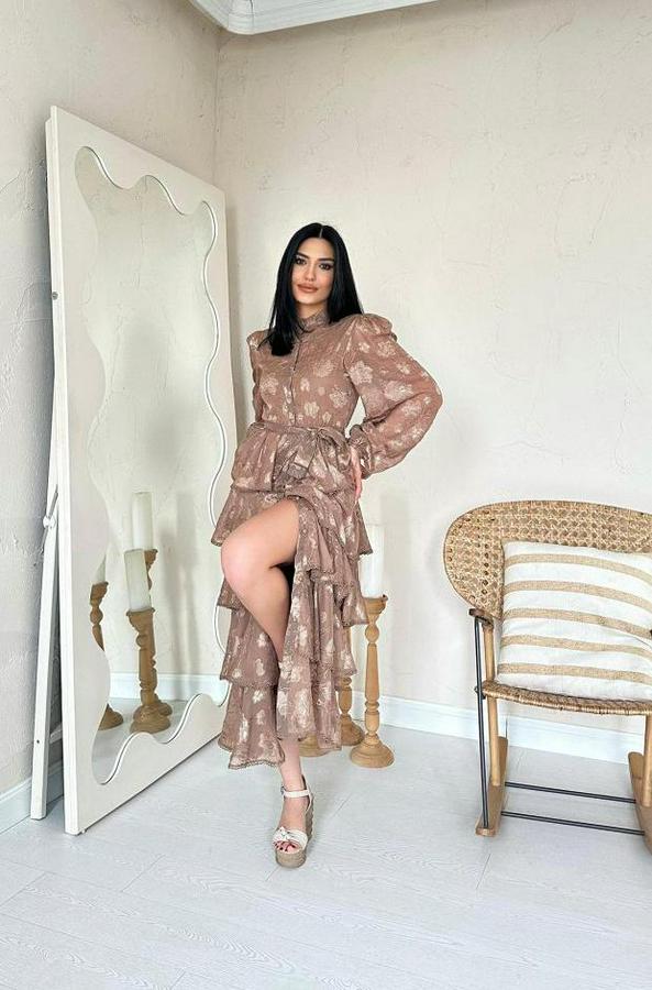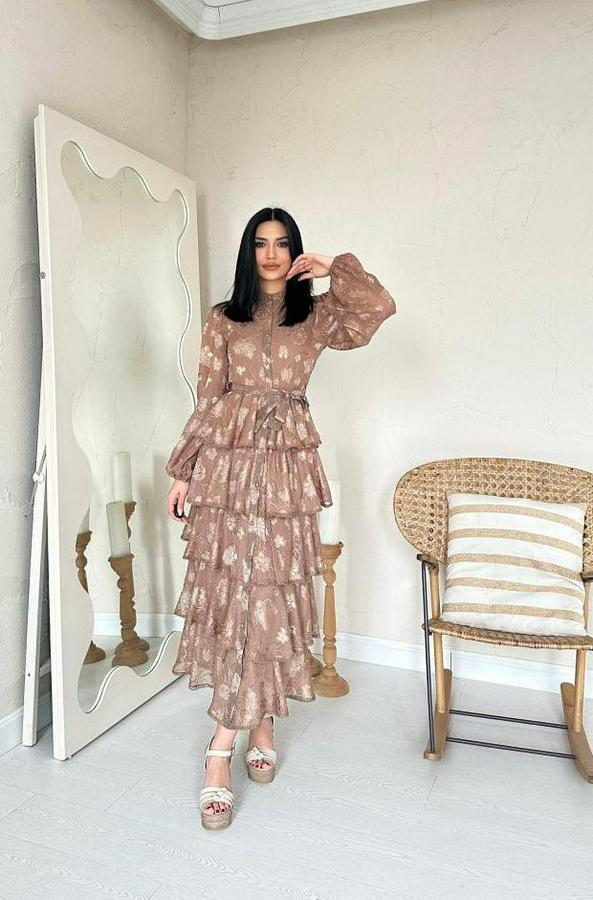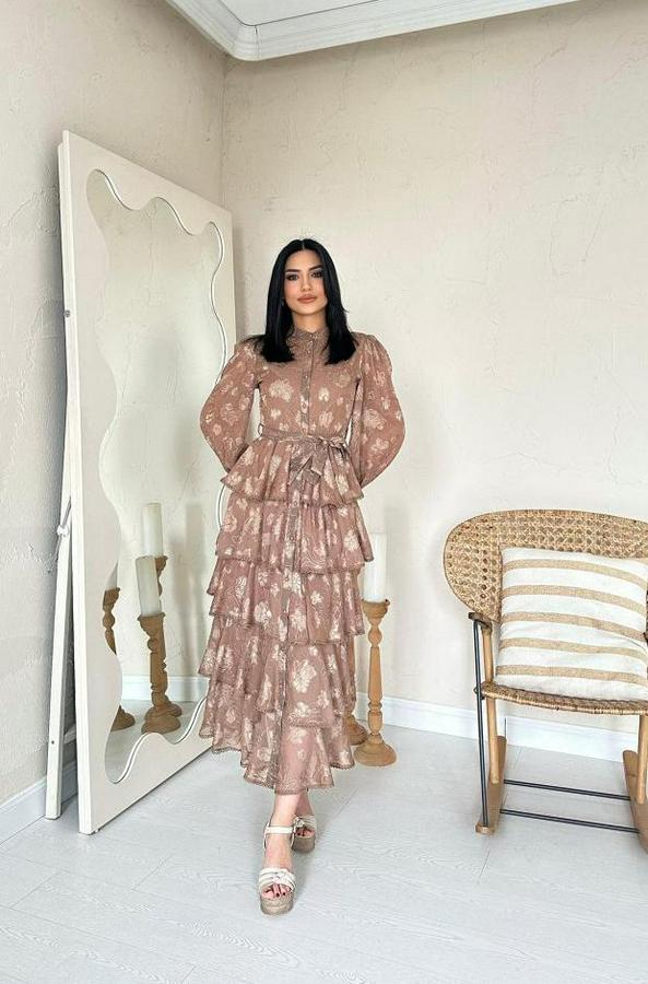 AnasayfaTüm ÜrünlerElbiseVizon Valonlu Şeritli Kat Kat Elbise
