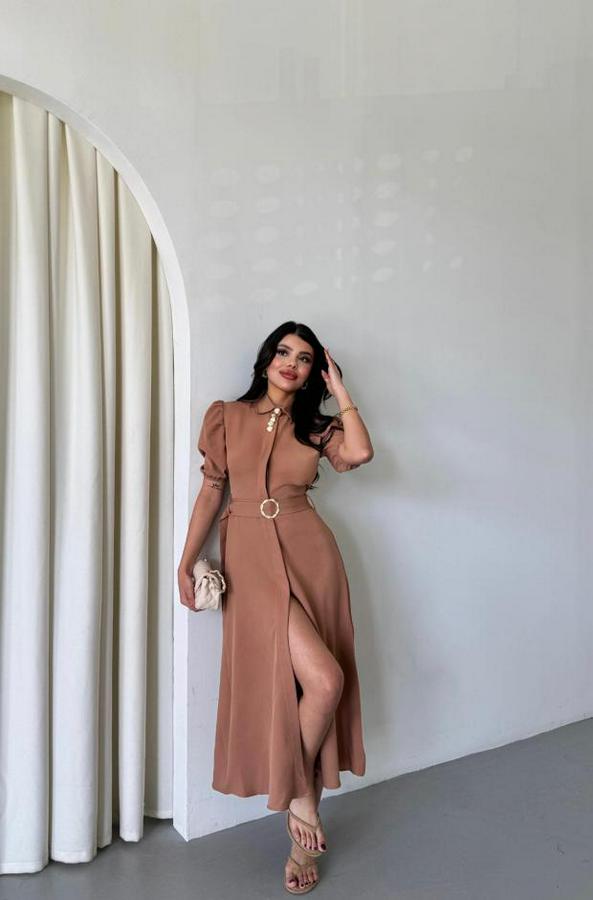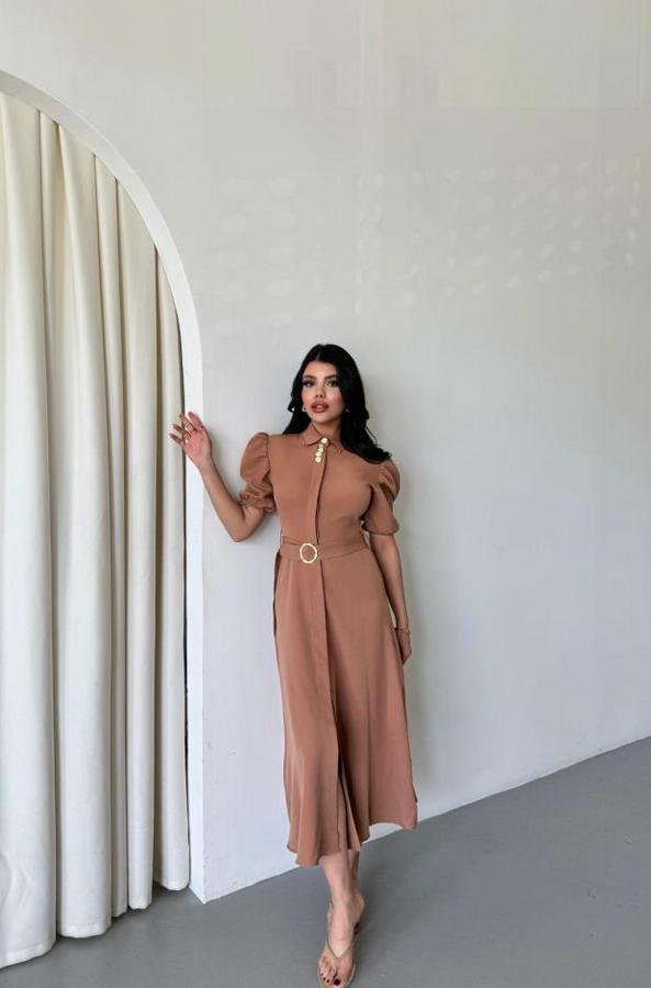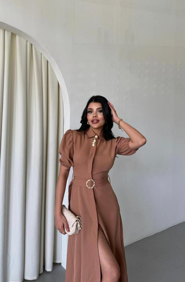 YAKA DÜĞME DETAYLI ELBİSE - Kahverengi