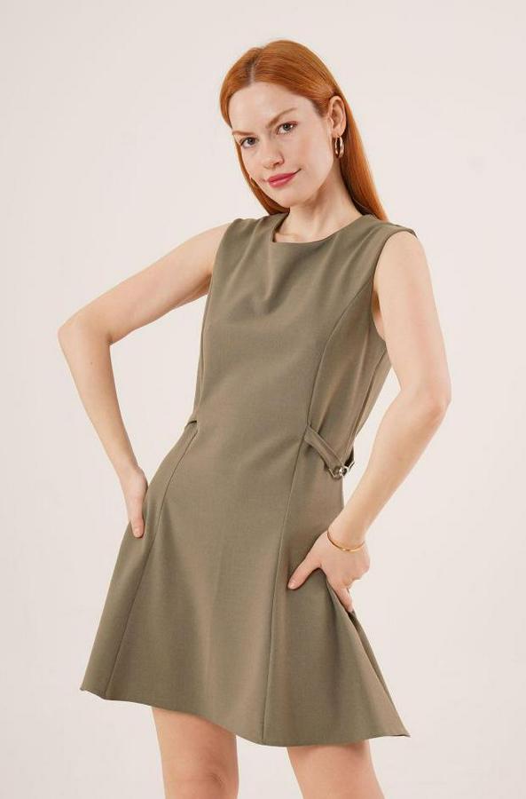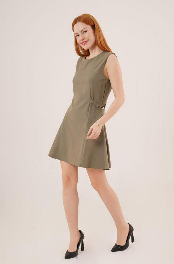 Yanları Zincir Detaylı Sıfır Kol Haki Mini Elbise
