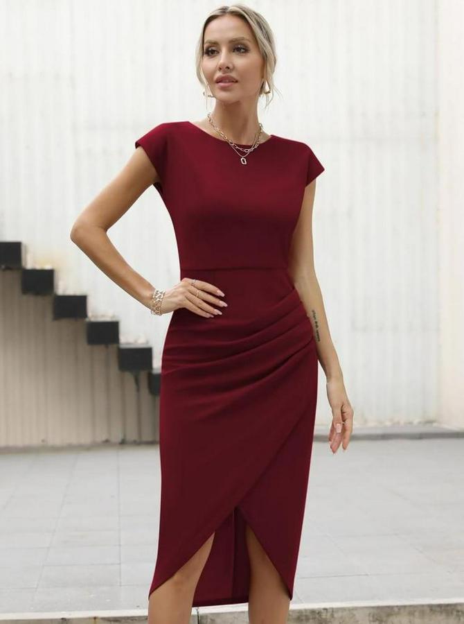 AnasayfaTüm ÜrünlerElbiseYarım Ay Kollu Bisiklet Yaka Yandan Drapeli Ithal Krep Elbise