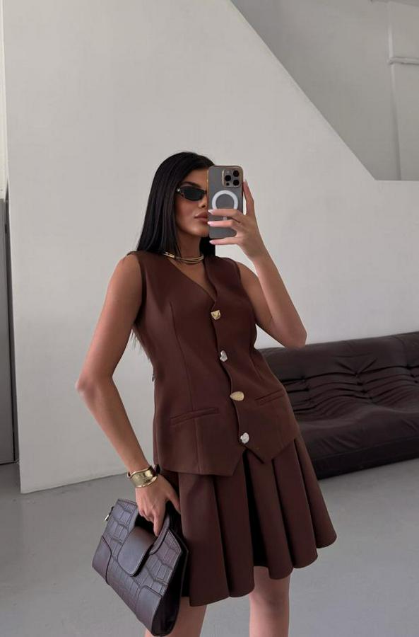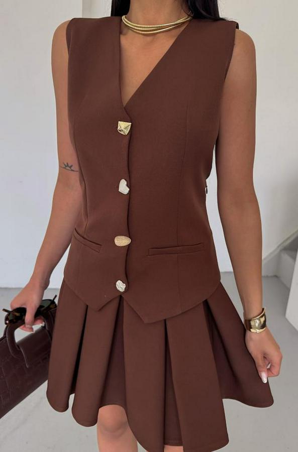 YELEK - PİLELİ ETEK GÖRÜNÜMLÜ ELBİSE - Kahverengi