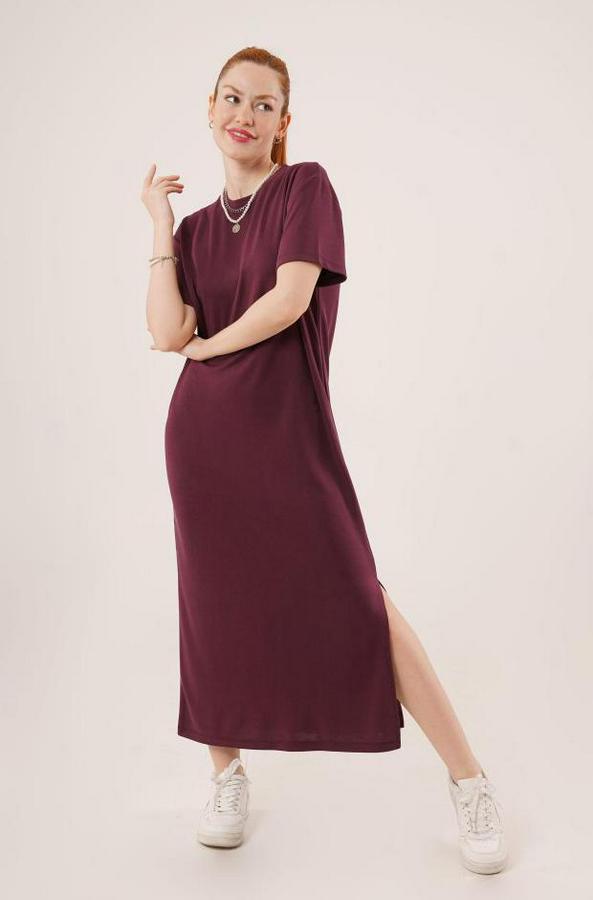 AnasayfaTüm ÜrünlerElbiseYırtmaç Detaylı Kısa Kollu Salaş Maxi Bordo Elbise