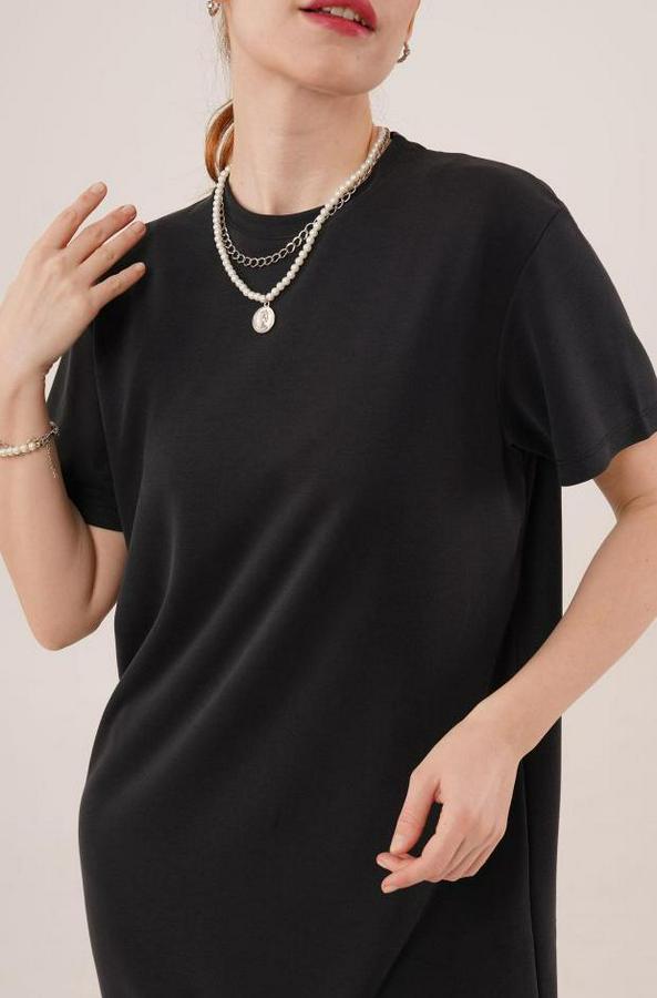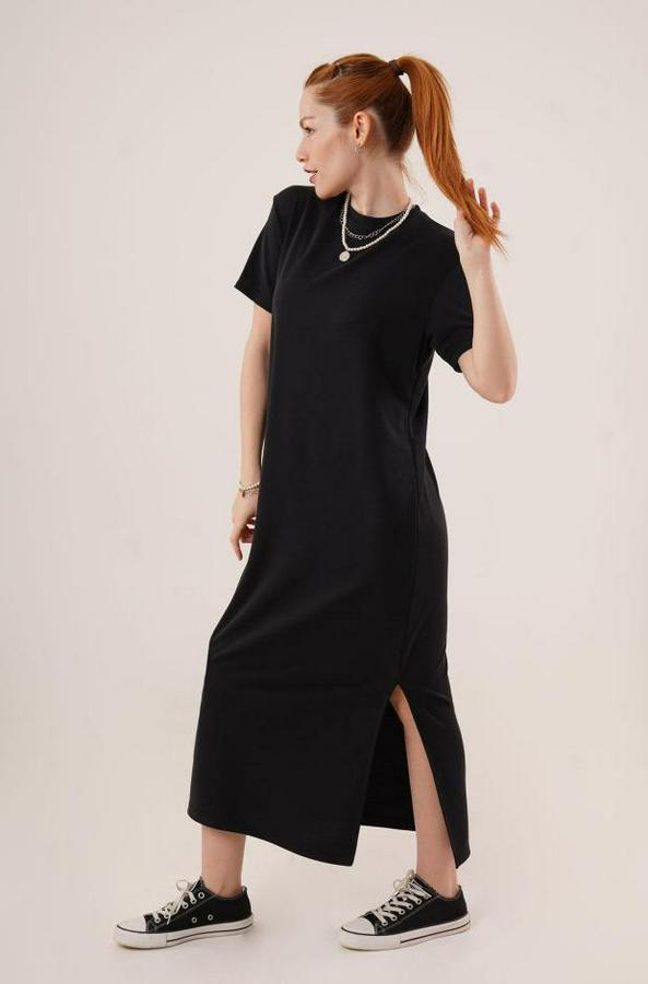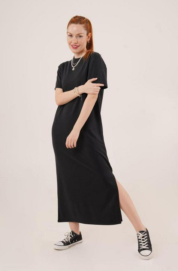 AnasayfaTüm ÜrünlerElbiseYırtmaç Detaylı Kısa Kollu Salaş Maxi Siyah Elbise