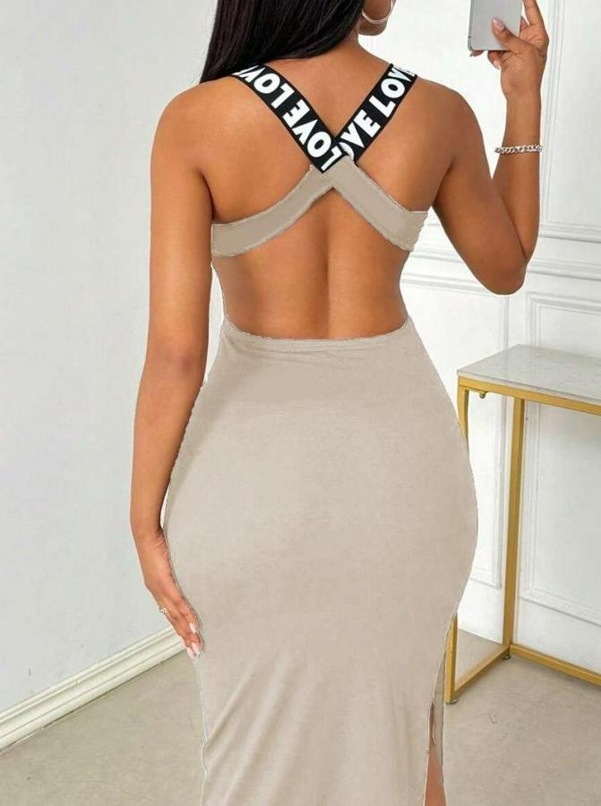 Yuvarlak Yaka Sırttan Çapraz Şerit Love Detaylı Yırtmaçlı Viskon Elbise
