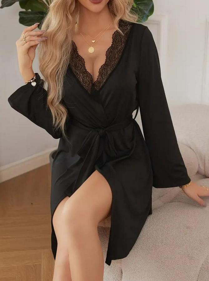 AnasayfaTüm ÜrünlerEv GiyimGecelikUzun Kollu Dantel Yakalı Belden Kuşaklı Viskon Gecelik