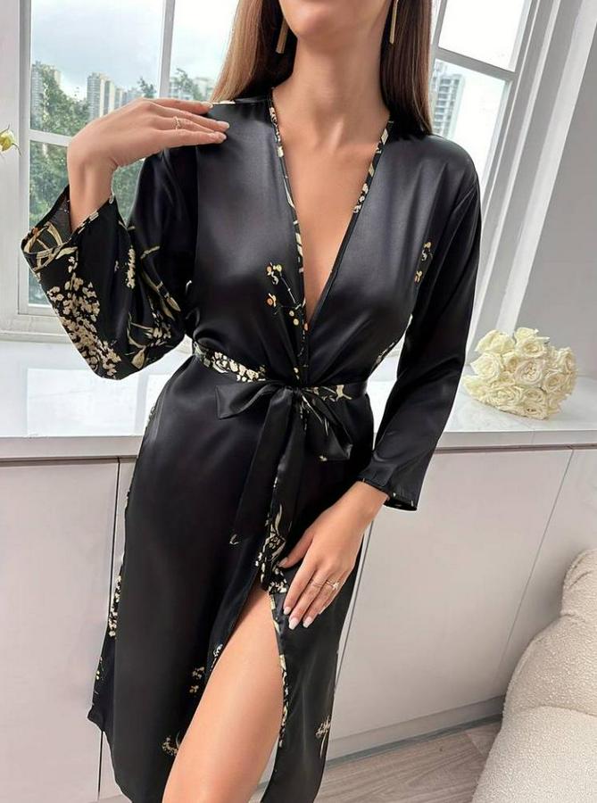 Kadın Uzun Kollu V Yakalı çiçek Baskılı Belden Kuşaklı Midi Saten Gecelik