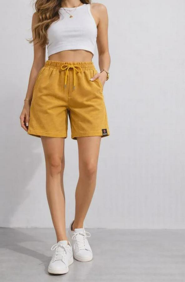 Dokuma Otoban Şort Beli Lastikli Bağcıklı, Cepli, Rahat Kesim Günlük Yazlık Şort - Hardal