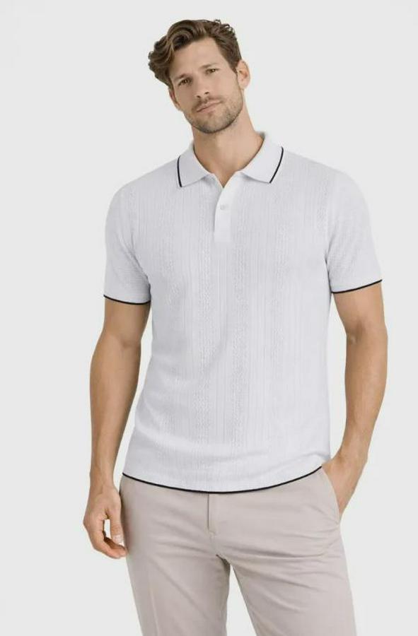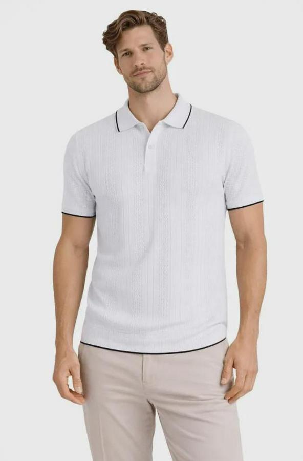 Erkek Düğmeli Yaka Triko Dokuma Tişört Desenli Yazlık Şık Günlük Triko Tişört - Beyaz