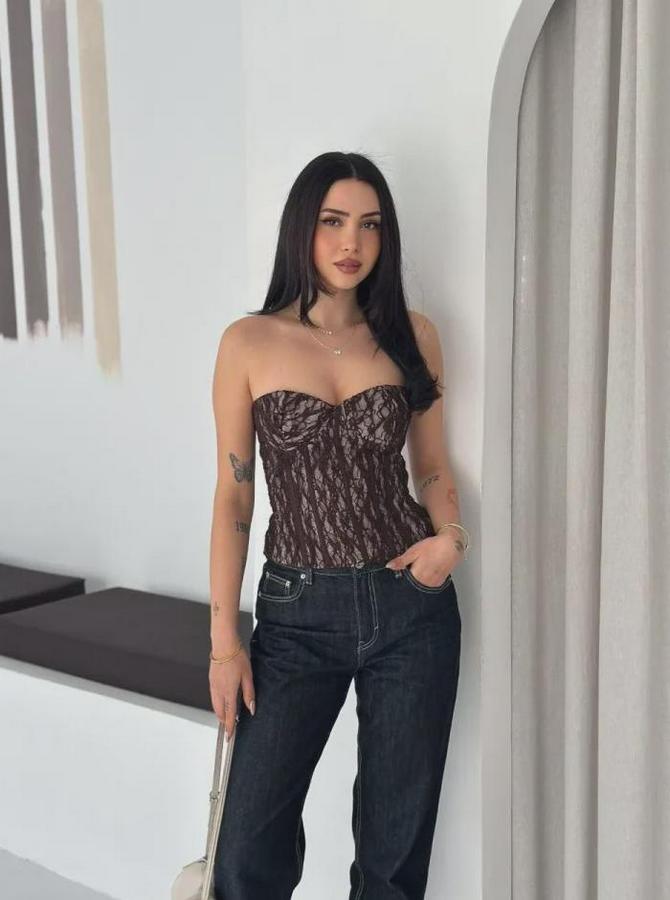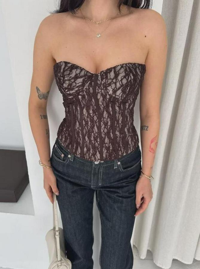 Fermuarlı Dantel Korse Straplez Bustiyer Transparan Şık Top - Kahverengi