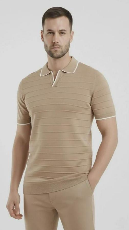 Erkek 2’li Paket Triko Yakalı Düğmesiz Açık Yaka Fitilli Kısa Kollu Regular Fit Tişört - Bej - Siyah