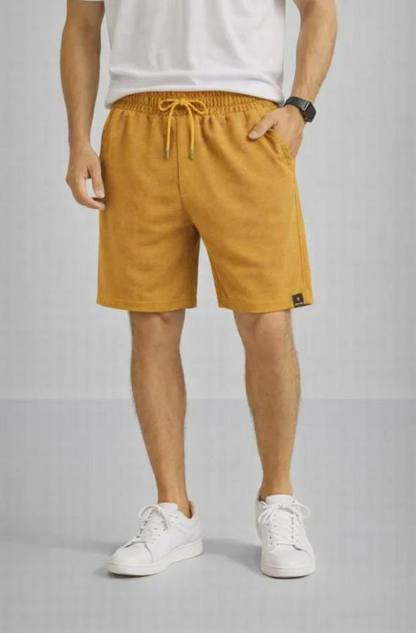 Erkek Otoban Dokuma Şort Beli Lastikli Bağcıklı, Cepli, Rahat Kesim Günlük Yazlık Şort - Hardal
