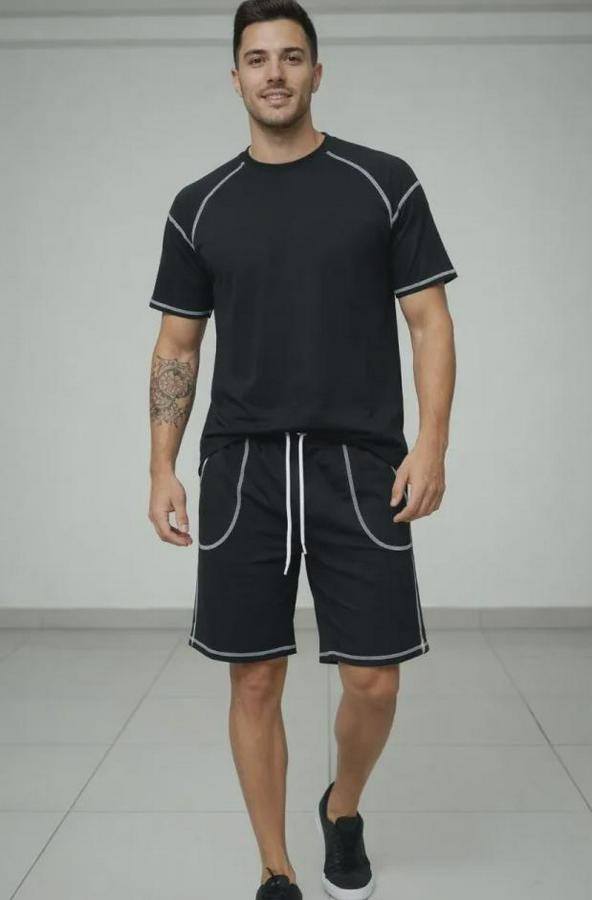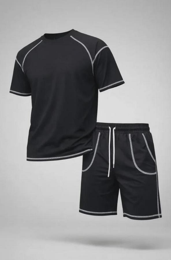Erkek Spor Tişört Şort Takım Kontrast Dikiş Detaylı Ovarsize Rahat Kalıp - Siyah