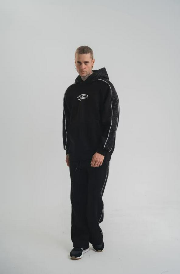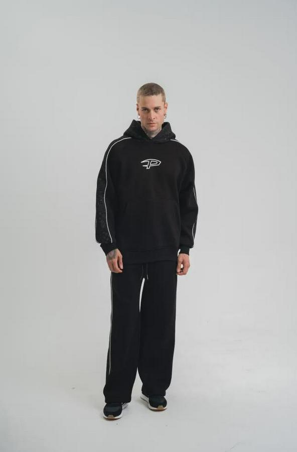 Uzun Kol Kapşonlu Ara Biyeli Baggy Eşofman Takım - Siyah