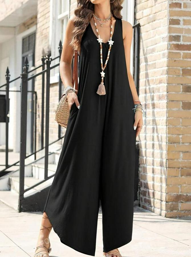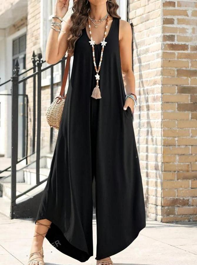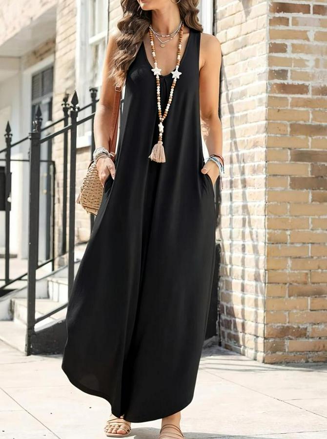 Askılı Yuvarlak Yaka Cepli Salaş Uzun Viskon Tulum