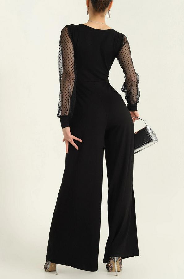 Kadın Derin V Yaka Kolları Puantiyeli Tül Detay Ispanyol Paça Tulum