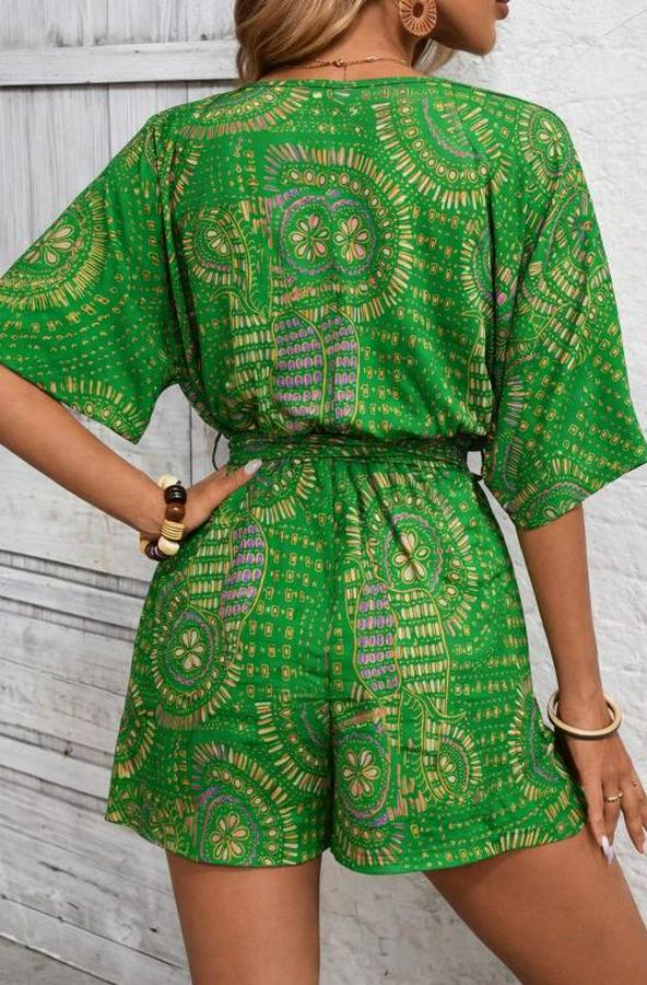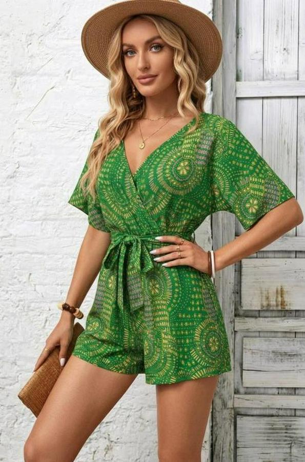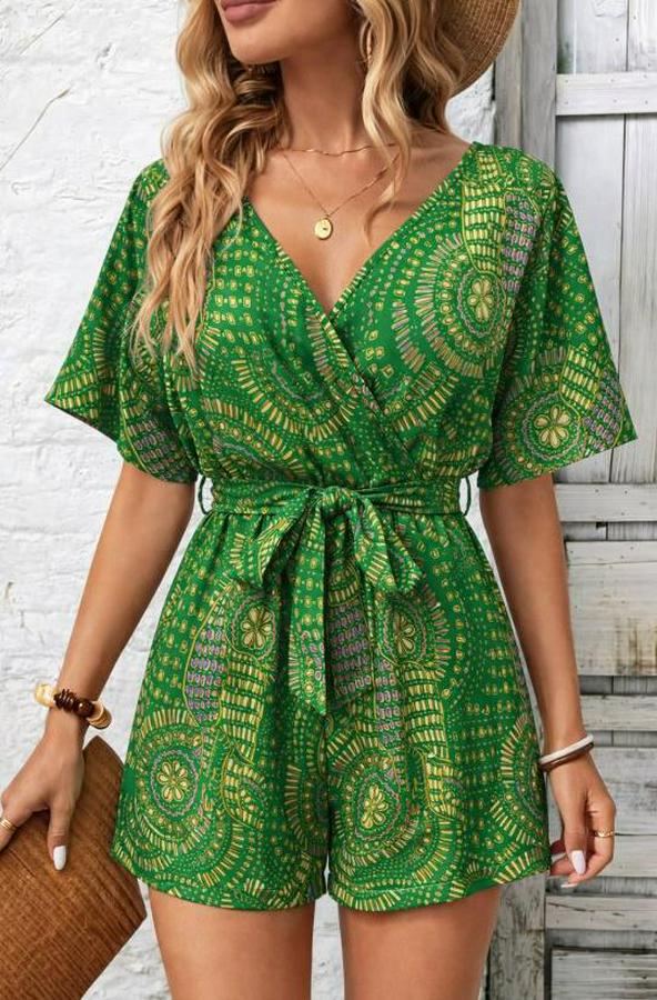 Kadın Kısa Kollu Kruvaze Yakalı Belden Kuşaklı Desenli Kısa Süprem Tulum