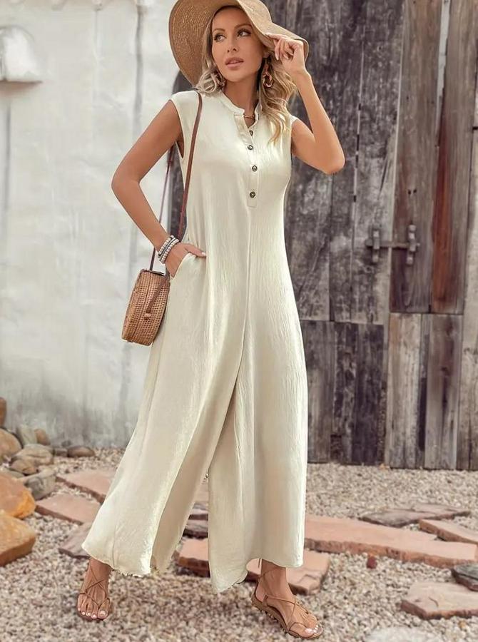 Kısa Kollu Önden Düğmeli Paçaya Doğru Geniş Cepli Uzun Bürümcük Tulum