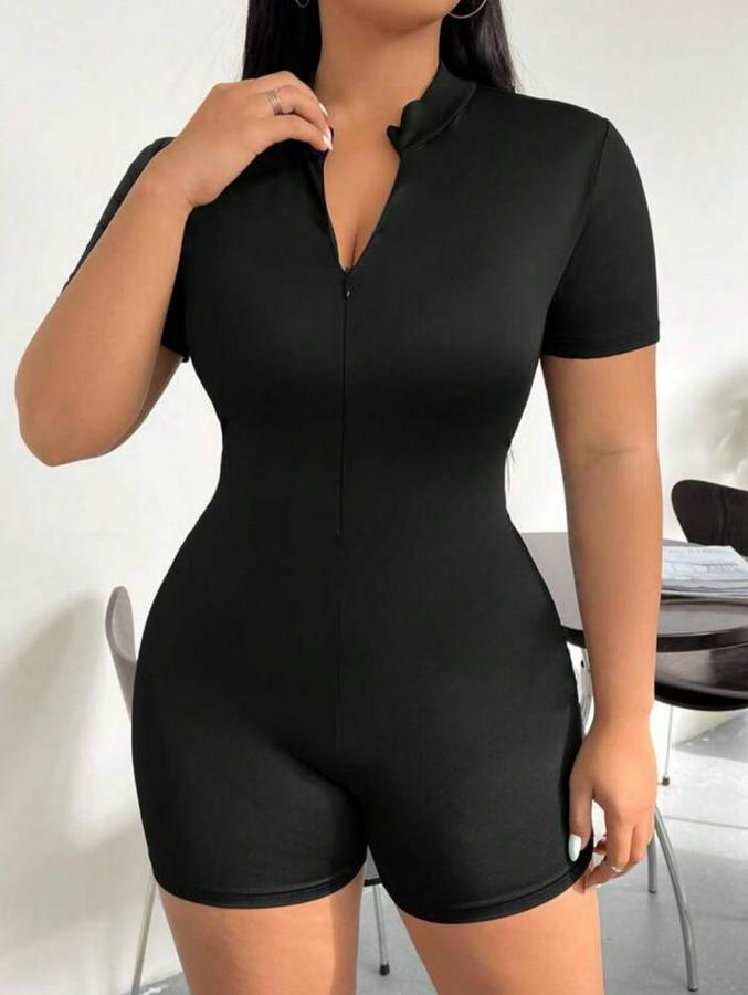 Kadın Kısa Kollu önü Fermuarlı Bodycon Dalgıç Tulum