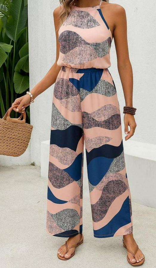 Kadın Omuzlardan Açık Boyundan Geçmeli Beli Lastikli Desenli Dalgıç Tulum