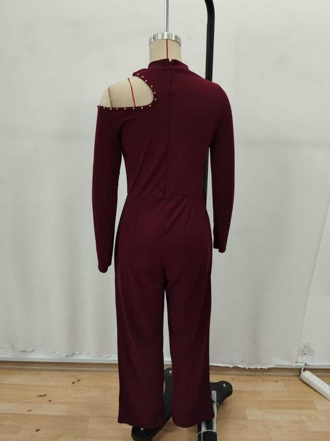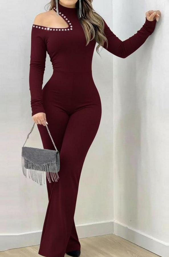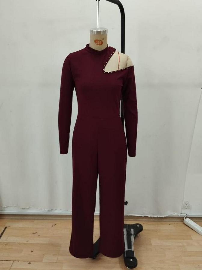 Kadın Tek Omuzdan Açık Balıkçı Yaka Taş Detaylı Uzun Ithal Krep Tulum