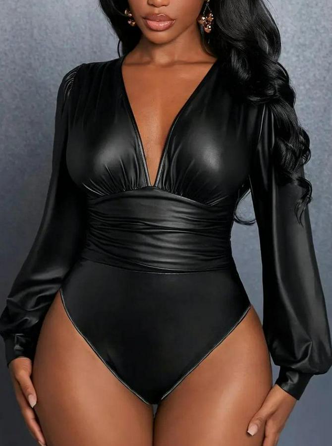 Kadın Uzun Kollu Derin V Yakalı Deri Zıbın
