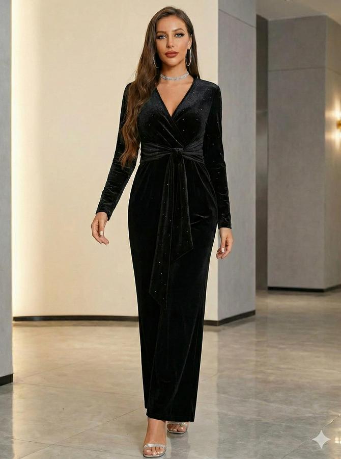 Uzun Kollu Kruvaze Yakalı Belden Kuşaklı Işıltılı Kadife Tulum