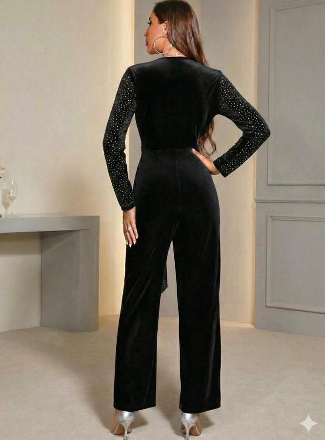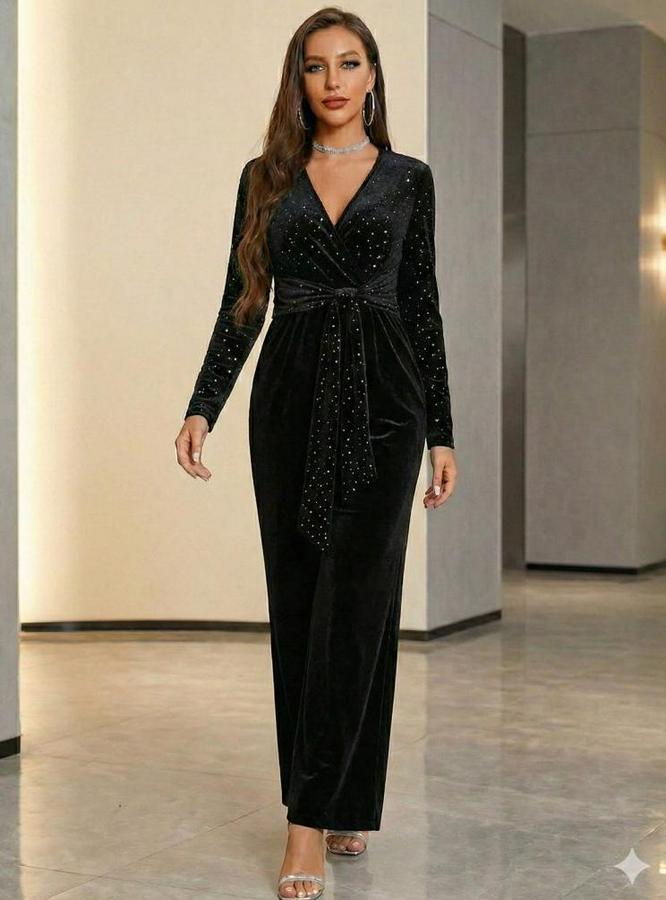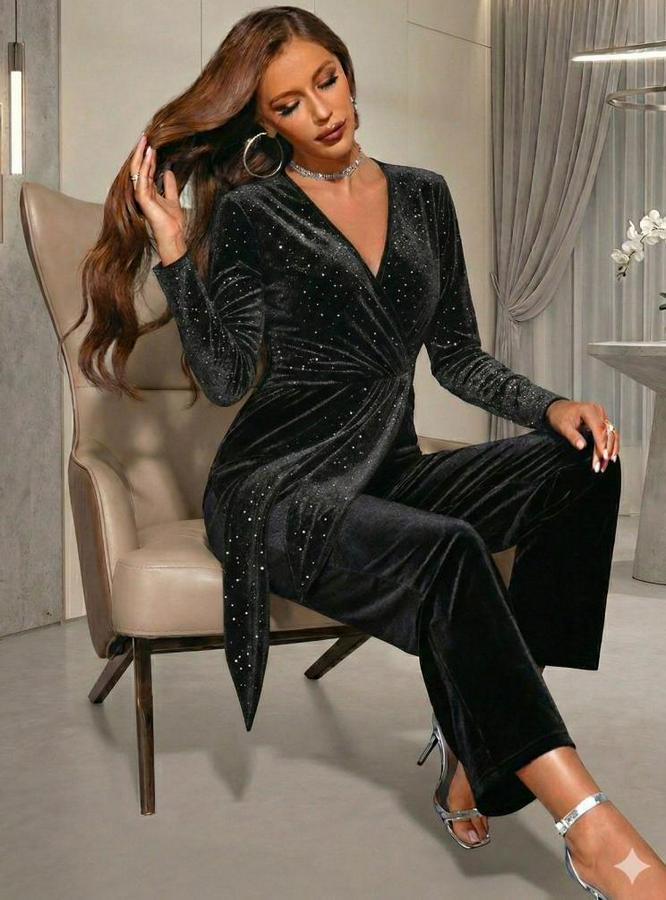 Uzun Kollu Kruvaze Yakalı Belden Kuşaklı Işıltılı Kadife Tulum