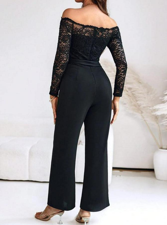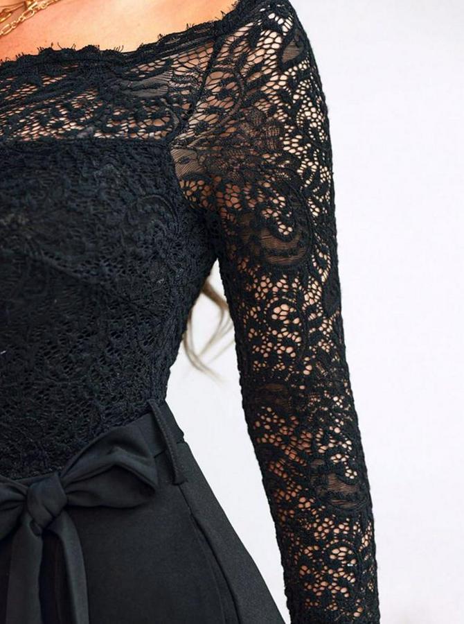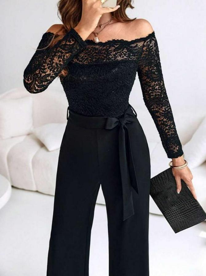 Kadın Uzun Kollu Madonna Yaka Dantelli Yandan Bağlamalı Ithal Krep Tulum