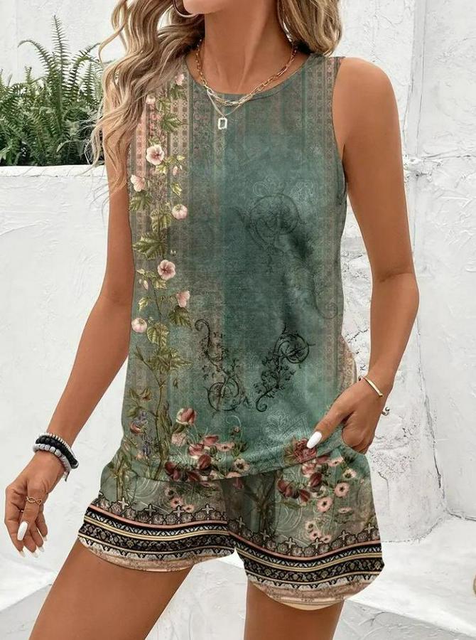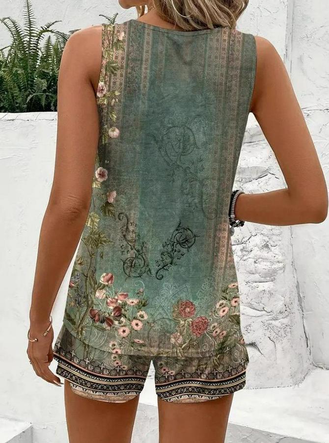 Askılı Yuvarlak Yaka Çiçek Baskılı Süprme Bluz Ve Short Ikili Takım