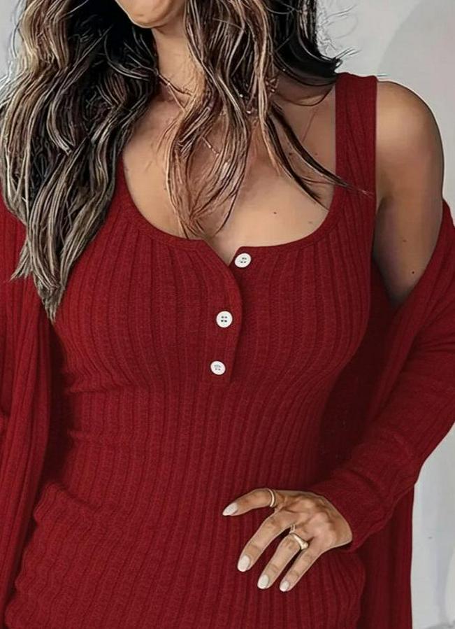 Askılı Yuvarlak Yakalı Önü Düğmeli Şardonlu Kaşkorse Mini Elbise Ve Kısa Ceket