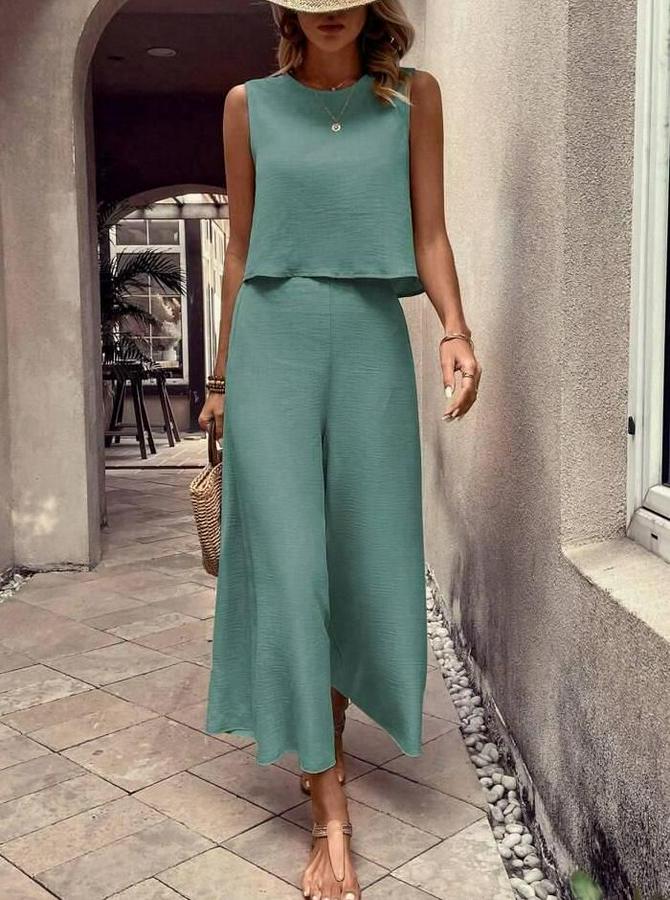 Kadın Bisiklet Yaka Kolsuz Bluz Ve Bol Paça Aerobin Kumaş Ikili Takım