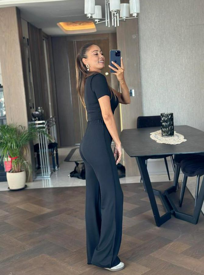 Kadın Bisiklet Yaka Pliseli Bluz Ve Ispanyol Paca Pantolon Ikili Takım