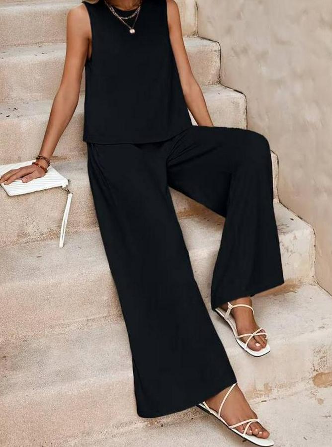 Kadın Biziklet Yaka Kolsuz Bluz Ve Salaş Ispanyol Paça Aerobin Kumaş Ikili Takım